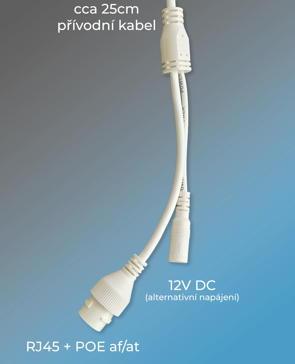 Funkce PoE napájení výrazně zjednodušuje instalaci a zvyšuje pohodlí při provozu bezpečnostních kamer. Tato IP kamera může být napájena přímo přes datový kabel na vzdálenost až 100 metrů (CAT5e), což eliminuje potřebu oddělených vodičů pro data a napájení, a to díky použití aktivního PoE podle standardu IEEE 802.3af. Navíc díky přítomnosti DC napájecího konektoru 2.5/5.5 na kabelu kamery je možné zajistit napájení i z 12V DC zdroje.