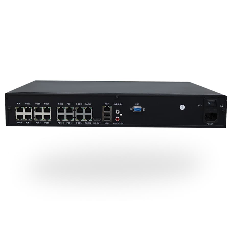 Síťový videorekordér s integrovaným PoE (16x RJ45). AI analytika běží přímo v rekordéru — funguje i s kamerami bez vlastní AI. ONVIF Profile S/T/G — kompatibilní s libovolnou IP kamerou. P2P vzdálený přístup z mobilní aplikace BitVision bez nutnosti veřejné IP.